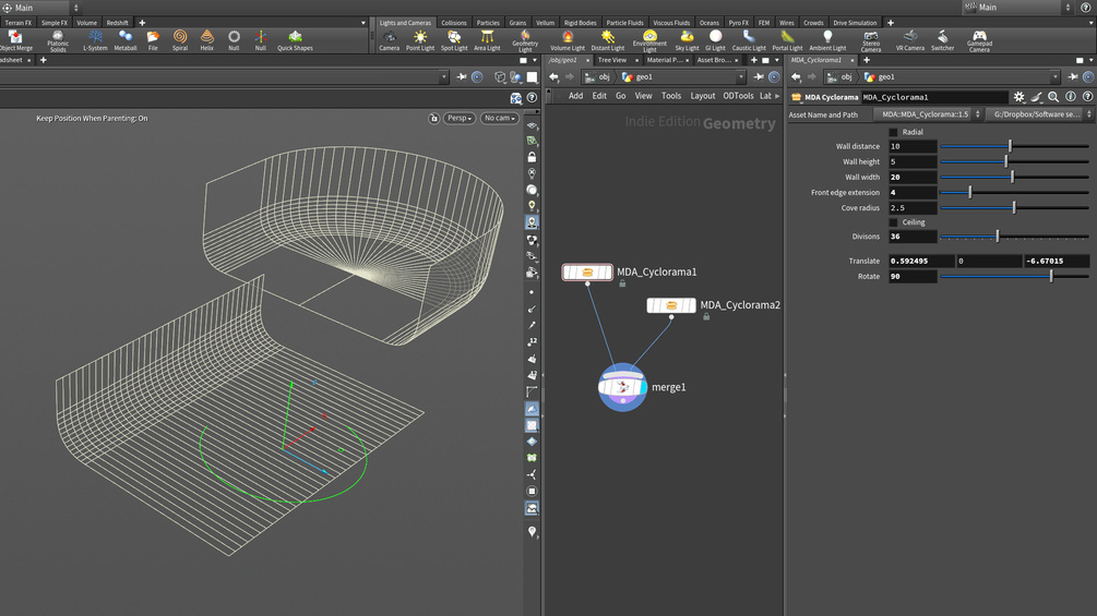 The MDA Cyclorama HDALC, is a HDA suitable for use in Houdini Indie. It offers a simple way to create a straight or radial 'cyc' backdrop for a studio type environment.